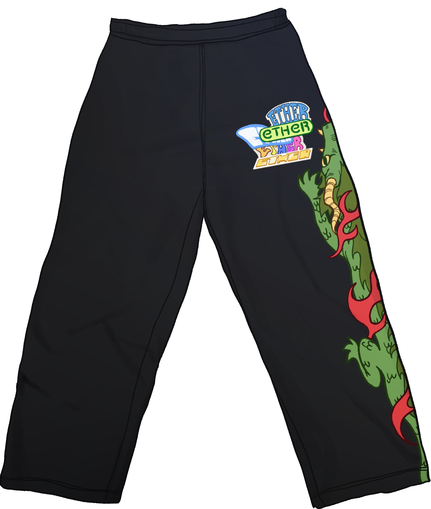 The Dragon Sweatpants have five custom-designed ETHER typography patches layered and sewn on top of each other, complemented by a printed dragon design along the right side, highlighting the craftsmanship that went into making the piece. The garment is ideal as a centrepiece for daily attire with its 100% cotton material and striking elements.