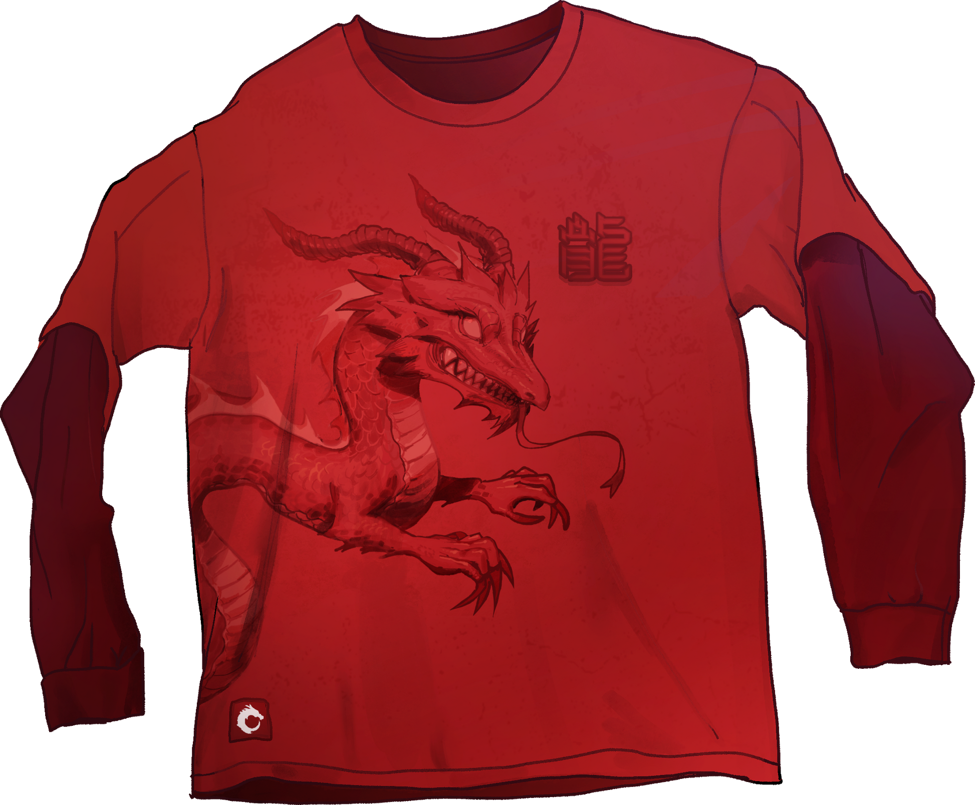 Crafted from 100% cotton and distressed washed fabric, this custom cut long sleeved tee adds a unique silhouette to the classic garment. It features an embroidered handwritten Chinese symbol for "Dragon" complemented by a printed representation across the front and back. The different shades of red gives a polished appearance to an essential piece of daily wear.